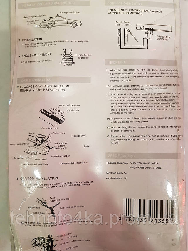 Хороша автомобільна антена зовнішньої установки. Ставитися на дах чи задній спойлер. Основа на самоклейці, до неї механічно пристібаються телескопічні висувні вуса. Ця автомобільна антена являє собою 4 незалежні антени, що з'єднуються в підсилювачі, що стоїть всередині автомобіля, який у свою чергу запитується від прикурювача і має 1 телевізійний вихід. Антена перевершує за якістю прийому Подільські антени, і за рахунок незалежних вусів, що змінюють довжину і своє становище в просторі, дозволяє домогтися більш-менш стійкого прийому ТБ сигналу. Якість складання непогана, коефіцієнт посилення в середньому 20дБ. Симпатичний зовнішній вигляд.