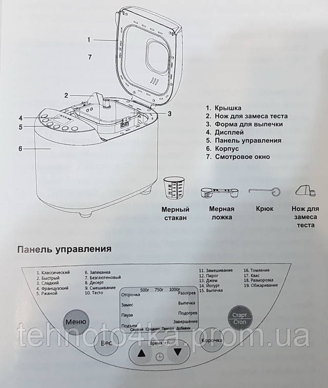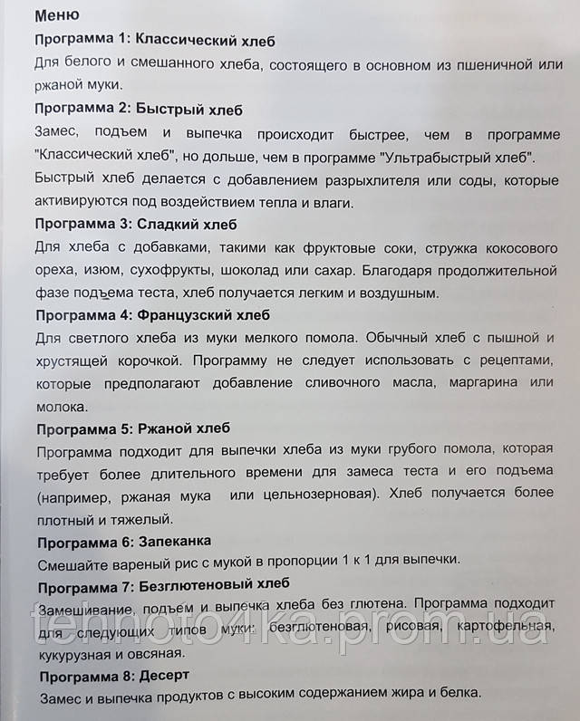 - Возможности приготовления: джем, йогурт, разморозка, тесто для пиццы, темный хлеб и быстрое приготовление хлеба